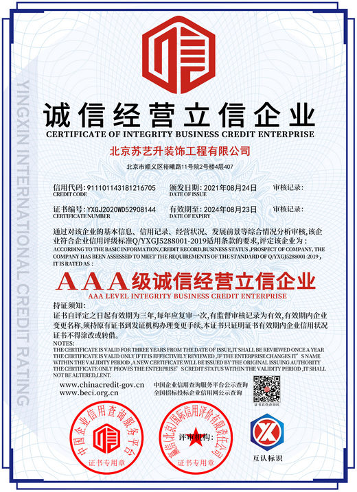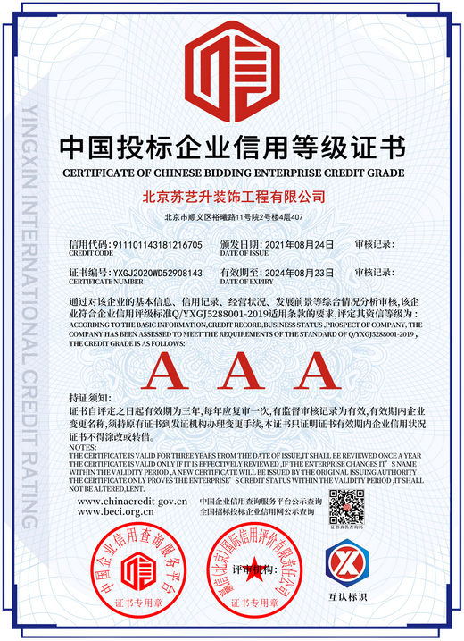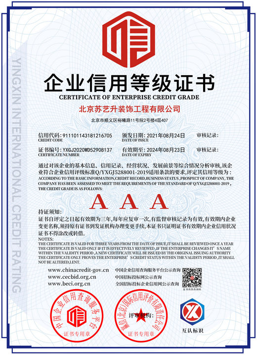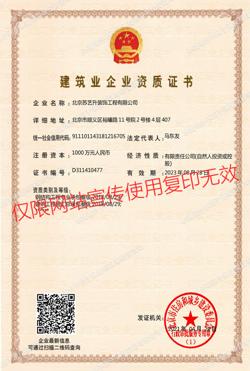 北京蘇藝升裝飾工程有限公司(以下簡稱”蘇藝升裝飾”)成立于2014年,公司前身根植于國內知名雙甲資質企業,通過裝飾行業20余年的磨礪,我們有著豐富的管理和施工經驗,以及一流裝飾公司的技術服務體系,通過不斷的努力和發展現已成為一家頗具實力的獨立法人企業,并成功獲取中華人民共和國住房和城鄉建設部頒發的:建筑裝修裝飾工程專業承包貳級、建筑工程施工總承包叁級、鋼結構工程專業承包叁級、建筑幕墻工程專業承包貳級以及防水防腐保溫工程專業承包貳級資質。 蘇藝升裝飾公司經過多年的磨礪及不...了解更多>